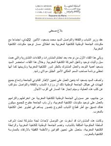 وأضاف بنسعيد أنه يتعين العمل على تحيين الإطار القانوني للجامعة وإدماج جميع الهيئات في هياكل الجامعة الوطنية ذلك أن وزارة الشباب والثقافة والتواصل ستواكب عن كثب هذه العملية، وسيتم إنجاز هذا المسار في أقرب الآجال.
