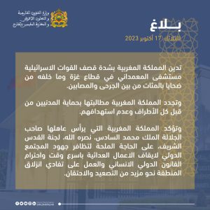 تدين المملكة المغربية بشدة قصف القوات الاسرائيلية مستشفى المعمداني في قطاع غزة وما خلفه من ضحايا بالمئات من بين الجرحى والمصابين.