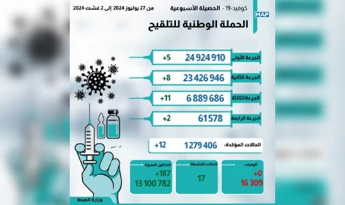 أعلنت وزارة الصحة والحماية الاجتماعية، اليوم الجمعة، عن تسجيل 12 إصابة جديدة ب “كوفيد-19″ دون تسجيل أي حالة وفاة، خلال الفترة ما بين 27 يوليوز المنصرم و02 غشت الجاري.