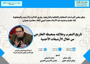 ينظم مختبر الدراسات المجالية والثقافية والتاريخية، وفريق الذاكرة والأرشيف والمخطوط يوم الأربعاء19 نونبر الجاري بكلية الآداب والعلوم الإنسانية عين الشق، جامعة الحسن الثاني بالدار البيضاء ، لقاءا علميا يستضيف فيه الأستاذ محمد أبيهي وهو أستاذ التاريخ المعاصر والراهن بكلية الآداب والعلوم الإنسانية بالرباط، الذي سيلقي محاضرة بعنوان:” تاريخ المغرب وعلاقته بمحيطه الخارجي من خلال الأرشيفات الأجنبية” وذلك بتنسيق من الأساتذة الأفاضل: ذ نوال متزكي، ذ مولاي الزهيد العلوي، ذسعيد واحيحي وذ محسن الإدريسي العمري.