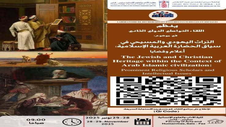 تنظّم جامعة سيدي محمد بن عبد الله بفاس، عبر كلية الآداب والعلوم الإنسانية سايس ومختبر البحوث والدراسات الثقافية والاجتماعية LARECSS، اللقاء التواصلي الدولي حول موضوع: «التراث اليهودي والمسيحي في سياق الحضارة العربية الإسلامية: أعلام وقضايا»