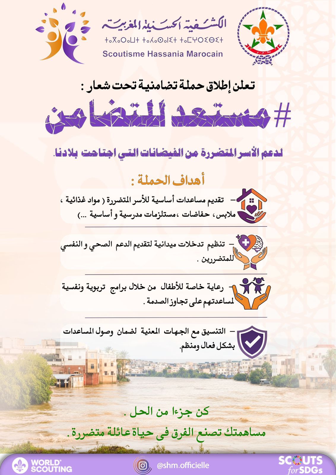 وجددت الكشافة التأكيد على التزامها الدائم بخدمة الوطن والمواطن، وترسيخ قيم التضامن والتآزر، داعية جميع المواطنين للانخراط في المبادرة والمساهمة في تخفيف معاناة المتضررين، معتبرة أن التضامن هو جوهر الميثاق الكشفي.