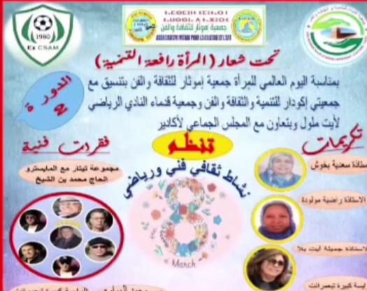 كما تتواصل فعاليات هذا الاحتفاء بالمرأة عبر نشاط رياضي موازٍ يعكس حضورها المتصاعد في المجال الرياضي، حيث ستُجرى مقابلة استعراضية في كرة القدم النسوية تجمع بين فتيات أيت ملول وفتيات أكادير، وذلك يوم الأحد 3 ماي 2026 بأحد ملاعب القرب بمدينة أكادير ابتداءً من الساعة الخامسة مساءً، في خطوة ترمز إلى كسر الصور النمطية المرتبطة بالرياضة النسوية وإبراز قدرات النساء في مختلف المجالات.